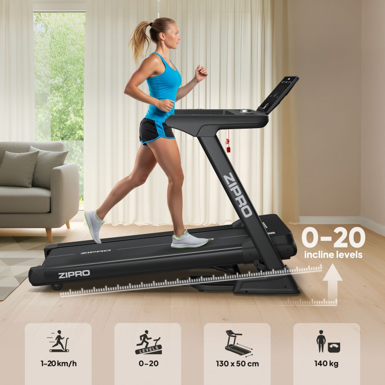 ZIPRO Sigma to bieżnia elektryczna z zakresem prędkości 1–20 km/h, więc sprawdzi się zarówno do spokojnego marszu, jak i szybkiego biegania/sprintów. Napęd ma moc 2610 W, a maksymalna waga użytkownika to 140 kg.