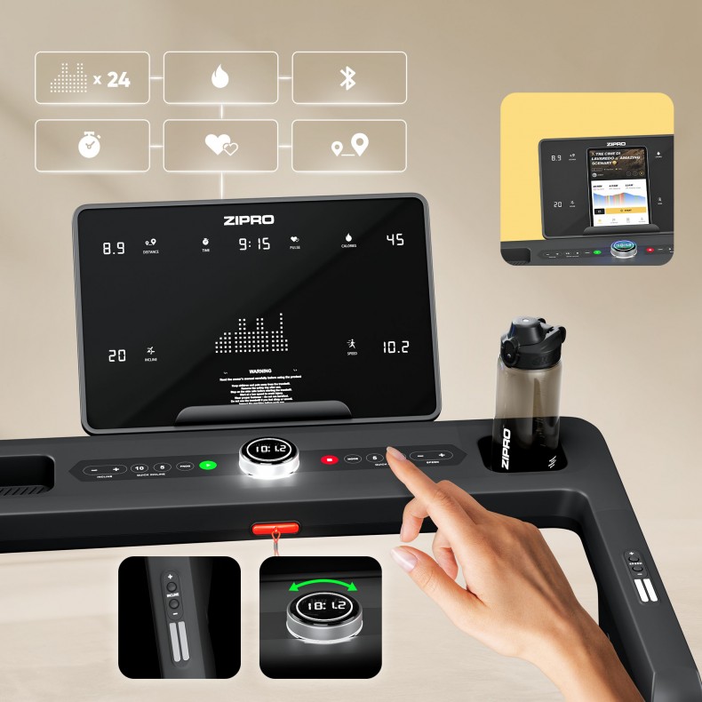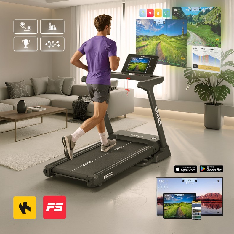 Bieżnia ZIPRO Sigma ma łączność Bluetooth i jest kompatybilna z aplikacjami FitShow oraz Kinomap, dzięki czemu możesz przenieść trening z samego „biegania w miejscu” na bardziej angażujące, prowadzone i mierzalne sesje.