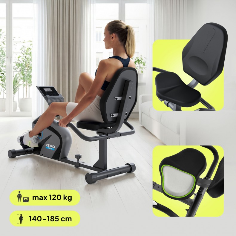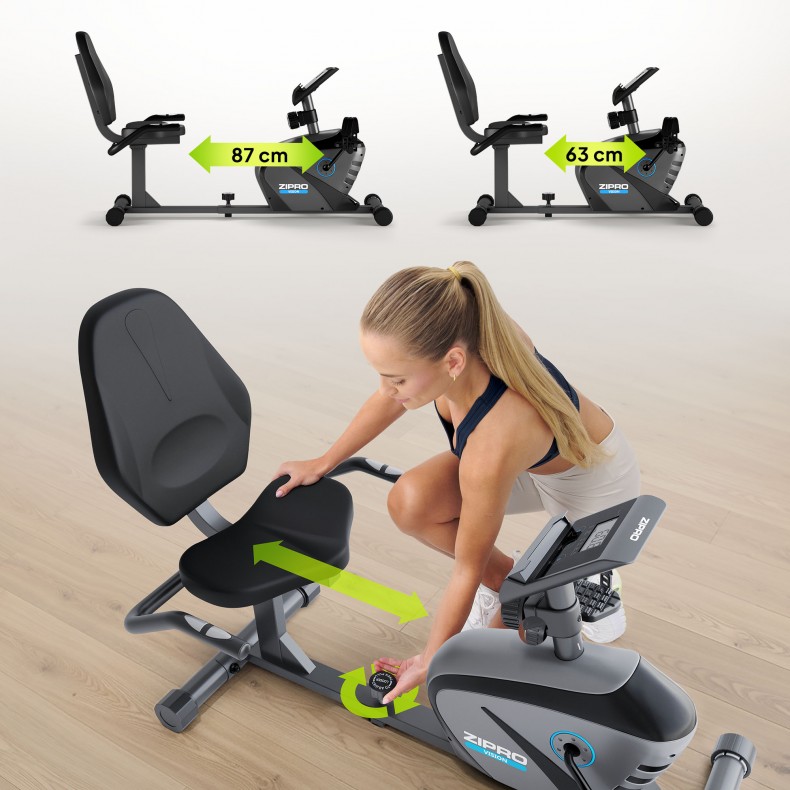 Niezależnie od budowy sylwetki oraz wzrostu rower Zipro Vision jest doskonałym sprzętem do domowego treningu fitness dla każdego. Wyposażony jest w skokową regulację odległości siodełka od pedałów w przedziale 77-102 cm. Regulacja jest prosta i nie wymaga narzędzi. Komfort w czasie ćwiczeń zapewnia wygodne, szerokie siedzisko, które wraz z ergonomicznym oparciem zostało odpowiednio wyprofilowane. Pozwala to na zachowanie poprawnej pozycji i odciąża kręgosłup.